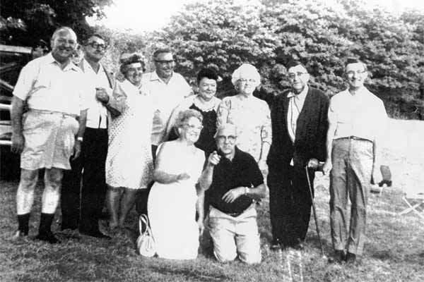 Rear L-R: Ken Musclow, Harold Musclow, Gertrude Musclow, Doug Linder, Lil Musclow, May Musclow, Bill Musclow, Reg Linder, In Front: Ruby Musclow and Fred Musclow Missing: Marie Linder, Deceased: Jack Musclow -- at Ken Musclow's country school house (date unknown) |